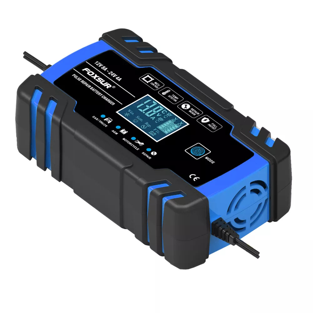 FOXSUR FBC122408D - полностью автоматическое зарядное устройство подходит для большинства типов аккумуляторов 12В и 24В, включая SLA, GEL, AGM, VRLA. Может восстанавливать батареи после глубокого разряда и сульфатированные АКБ.