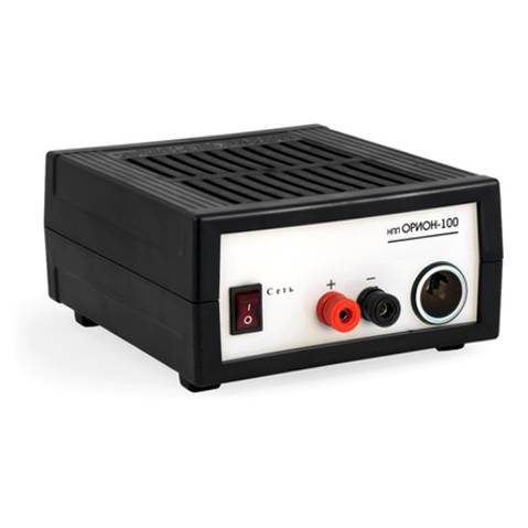 НПП Орион-100 - зарядное устройство, которое является эквивалентом бортовой цепи автомобиля с работающим двигателем. Используется для автоматической подзарядки или предпусковой подготовки аккумулятора после продолжительной стоянки. Выходное напряжение стабилизировано на уровне 14,2-14,4 В при токе потребления от 0 до 15 А.