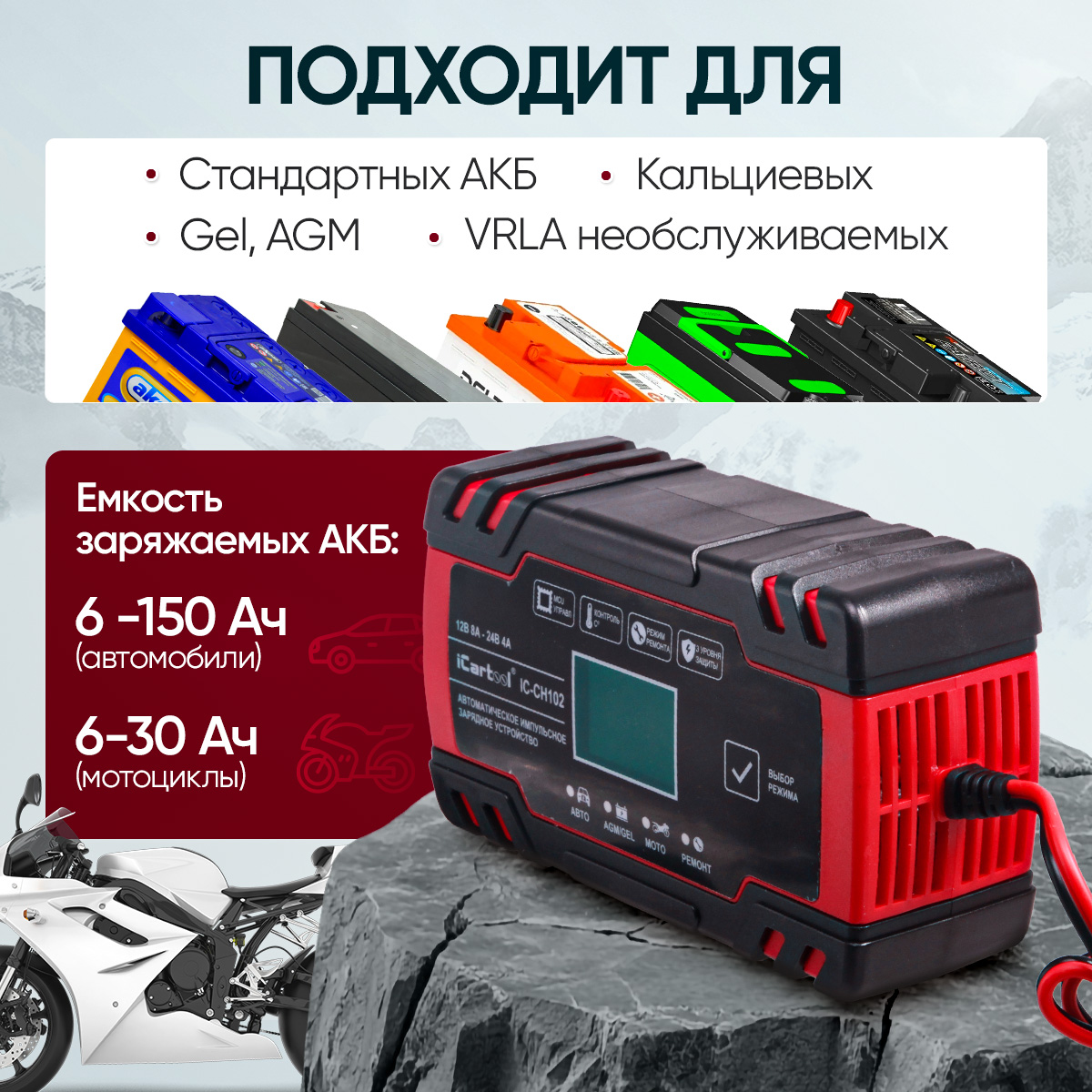 Автоматическое импульсное устройство 2 в 1 iCartool IC-CH102 предназначено для заряда и восстановления всех типов свинцово-кислотных аккумуляторных батарей (АКБ) 12В/24В, включая АКБ типов AGM/GEL.