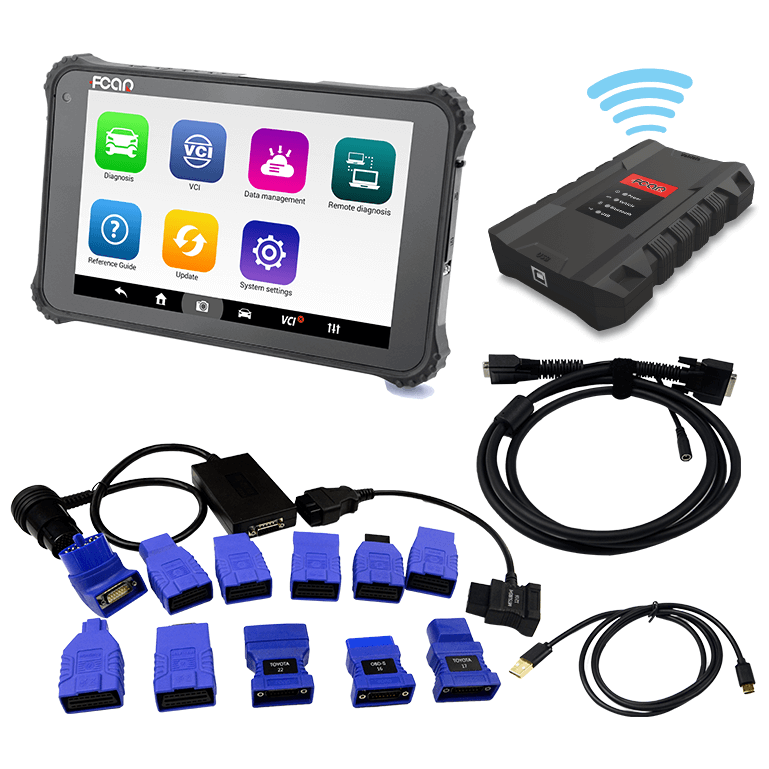 Оборудование представляет собой беспроводной VCI модуль с поддержкой Bluetooth и WiFi, подключаемый к диагностической колодке автомобиля, и пыле/влаго/ударозащищённый планшетный компьютер на операционной системе Android 4.4.