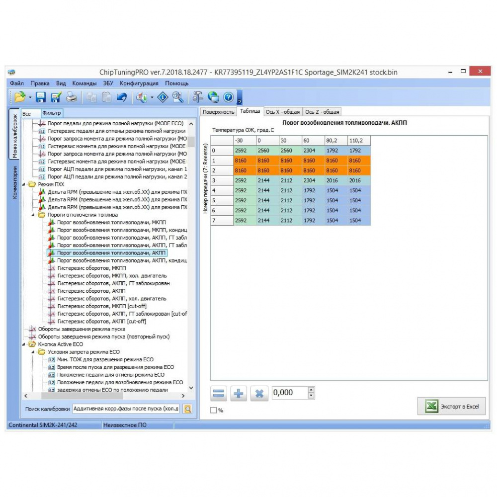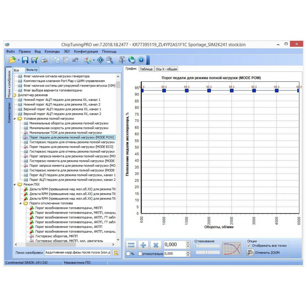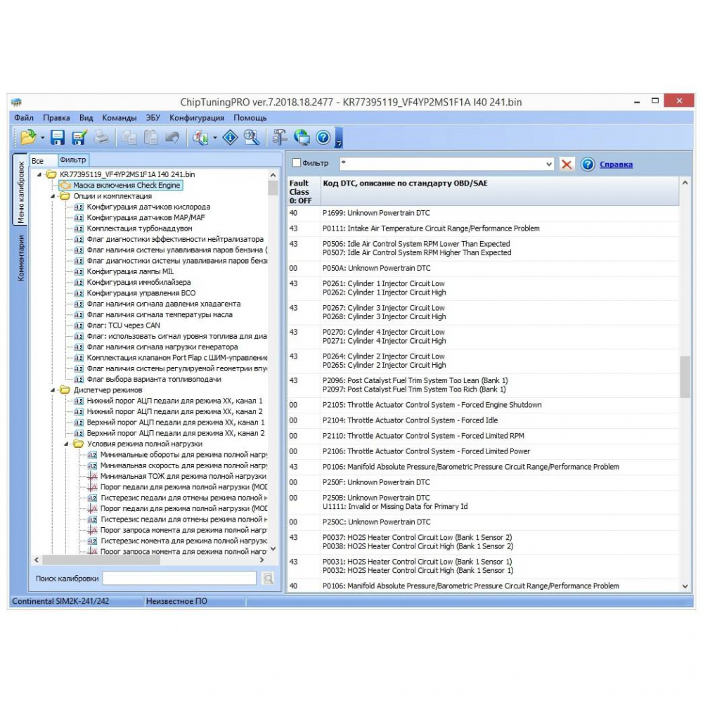 Для изменения доступны калибровки диспетчера режимов (переход на режим обогащения по педали и моменту), оборотов холостого хода и его коррекций, топливоподачи во всех режимах, включая фазу впрыска, УОЗ со статическими и динамическими коррекциями, калибровки моментной модели, лимитеры дросселя/момента/оборотов/скорости, калибровки фильтра момента, тарировки датчиков, характеристику форсунок, калибровки системы регулирования геометрии впускного тракта и системы VVT, калибровки системы кондиционирования, калибровки управления ВСО, калибровки условий и пределов адаптаций по лямбда-зонду, маску DTC и многое другое.
