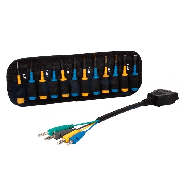 Благодаря такому набору размеров и форм контактов можно корректно подключаться к большинству распространённых разъёмов датчиков ABS/ESC и контроля износа, выполнять прозвонку цепей, измерять сигналы и подавать питание на целевые контуры. Универсальный провод и кабели питания расширяют сценарии применения — от стационарной диагностики в цехе до выездных работ, когда питание удобно взять от гнезда прикуривателя. -