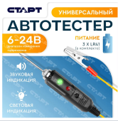 Тестер электрической цепи СТАРТ со звуковой и световой индикациями предназначен для быстрой и эффективной диагностики электрооборудования автомобилей. Позволяет определить полярность напряжения (+/-), выявить замыкание и обрыв проводки или проверить предохранители, лампочки и диоды. Тестер выполнен из ударопрочного ABS-пластика, имеет 2 световых индикатора зеленого и красного цветов, металлический щуп. Изделие снабжено проводом с зажимом типа «крокодил». Устройство работает от 3 батареек типа LR41 (установлены в прибор).