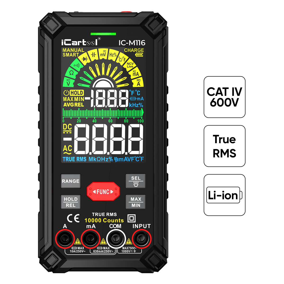 Интеллектуальный цифровой мультиметр IC-M116 — это надежный профессиональный инструмент с автоматическим выбором режима измерения, встроенным Li-ion аккумулятором и множеством дополнительных функций. Он оснащен высококонтрастным цветным дисплеем с VA-матрицей, обеспечивающим четкость отображения данных. Мультиметр соответствует высокому классу электробезопасности CAT III 1000В и CAT IV 600В, обеспечивая надежную защиту при работе с высокими напряжениями. Показания этого мультиметра будут максимально точными благодаря измерению истинных среднеквадратичных значений (True RMS).