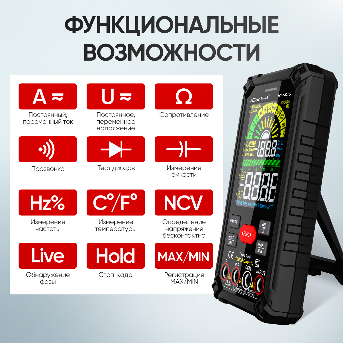 С помощью смарт мультиметра IC-M116 вы сможете измерить:- В режиме Smart (автоматическом):