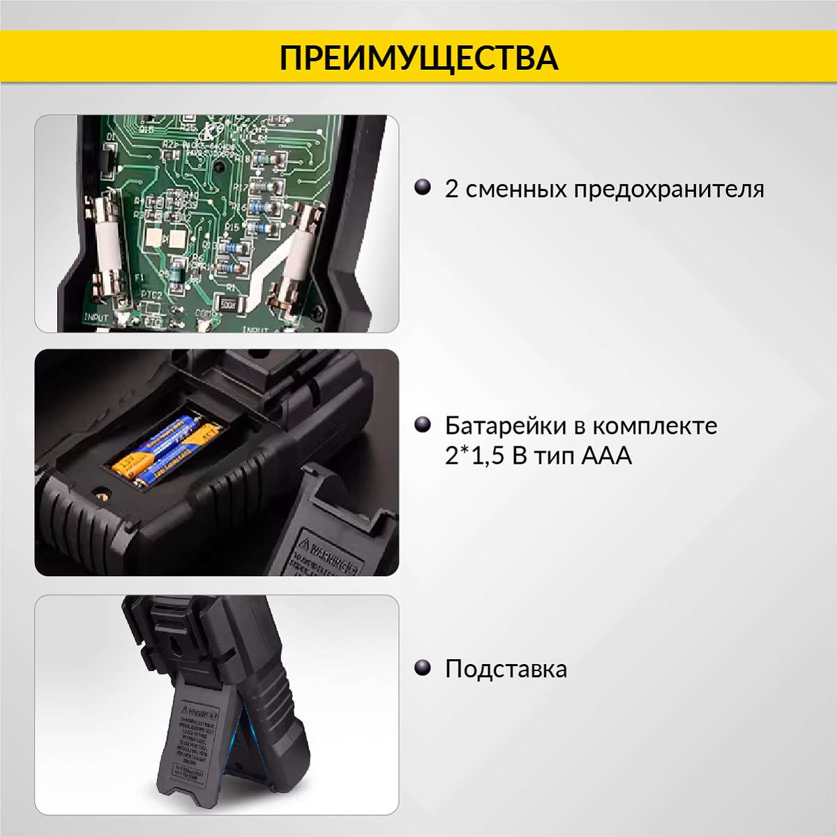 - Практичный дизайн: на задней стенке мультиметра предусмотрены крепления для тестовых щупов, а также подставка, что позволяет удобно разместить мультиметр на поверхности