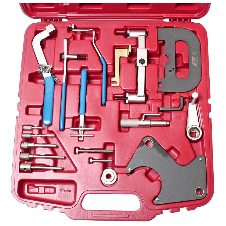 Набор JTC-4770A состоит из всех необходимых элементов, использующихся для различных мероприятий в автомобилях Renault: фиксация маховика и коленчатого вала, фиксация вала ТНВД, снятие шкива (съемник) и т.д.