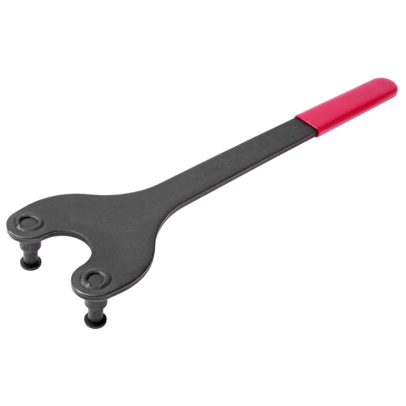 Инструмент имеет упорные штифты с канавками (бороздками), используемые для фиксации шкива распредвала в неподвижном положении при откручивании центрального болта вала. -
