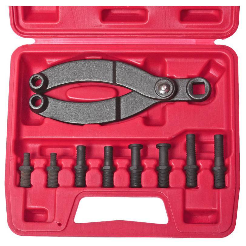 Насадки, поставляемые в комплекте (8 шт.) обеспечивают работу с любым диаметром отверстий. Фиксатор оснащен присоединительным квадратом 1/2" для удержания шкива.