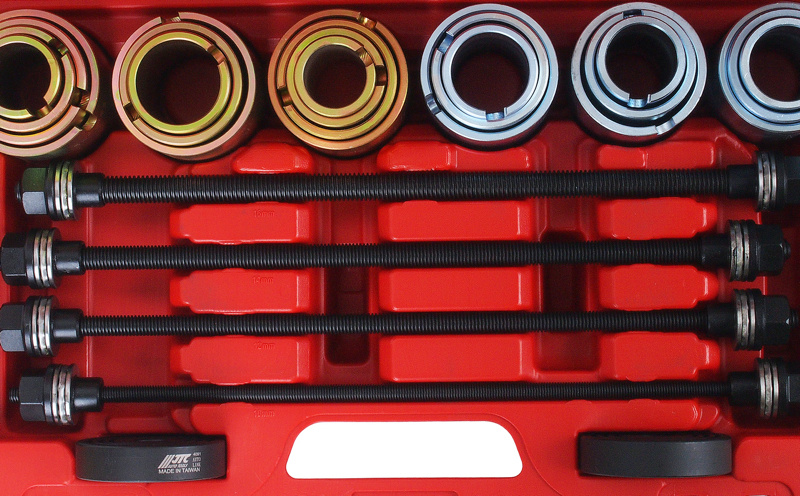 Набор инструментов для демонтажа сайлентблоков JTC-4091 используется для снятия и установки сайлентблоков и резиновых втулок. Общее количество предметов в наборе - 26. Набор подходит для большинства автомобилей.