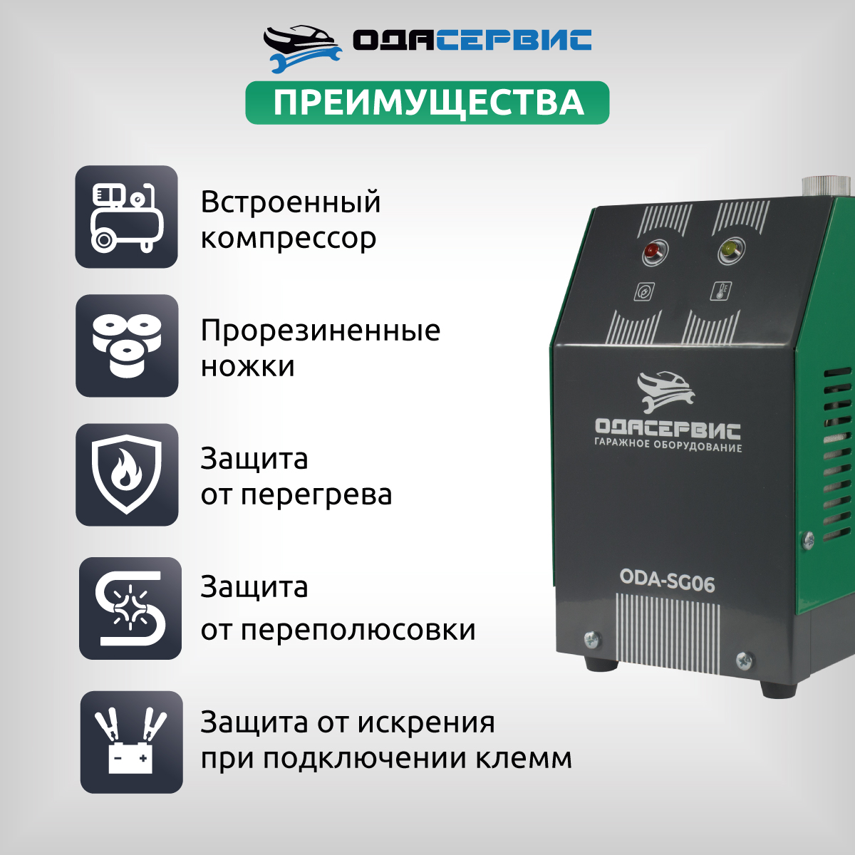 ODA-SG07Питание 12/24 В 12В 12В 12В Встроенный компрессор + + + Выходное давление, psi 8-10 19-23 19-23 Производительность, л/мин 5 8 8 Защита от перегрева + + + + Защита от ненадежного подключения (искрения) аккумуляторных клемм + + + Защита от неправильного подключения (переполюсовки) + + + Защита от короткого замыкания свечи накаливания + + + Защита от короткого замыкания корпуса дымогенератора с + клеммой аккумулятора + + + Расход жидкости 1 мл 1мл 1мл 1мл Объем заправляемой жидкости до 10 мл до 30 мл до 20 мл до 20 мл Длина шланга 2 м 2 м 1,5 м 1,5 м Длина Дополнительной воздушной трубки 1 м Режимы работы 5, 10, 15, 20 мин. Потребляемый ток 8А при 12В, 4А при 24В 12А при 12В 12А при 12В 12А при 12В Генератор дыма + + + + Регулятор давления + + Шприц для заправки дымовой жидкости + + + + Дымовая жидкость 100 мл 100 мл Комплект пробок для подачи дыма 12/18, 17/23, 23/29, 32/38 12/18, 17/23, 23/29, 32/38 Адаптер для воздушной трубки, универсальный конусный адаптер Адаптер для воздушной трубки, воздушная трубка, конус-заглушка, ключ для сердечника клапана, адаптер EVAP, адаптер универсальный, комплект конусных заглушек 5/14, 14/22, 22/31, 31/40, 40/48, 48/57, 57/65, 65/74 Подвес + + + + Дополнительная воздушная трубка + Инструкция по эксплуатации + + + + Кейс для хранения + -