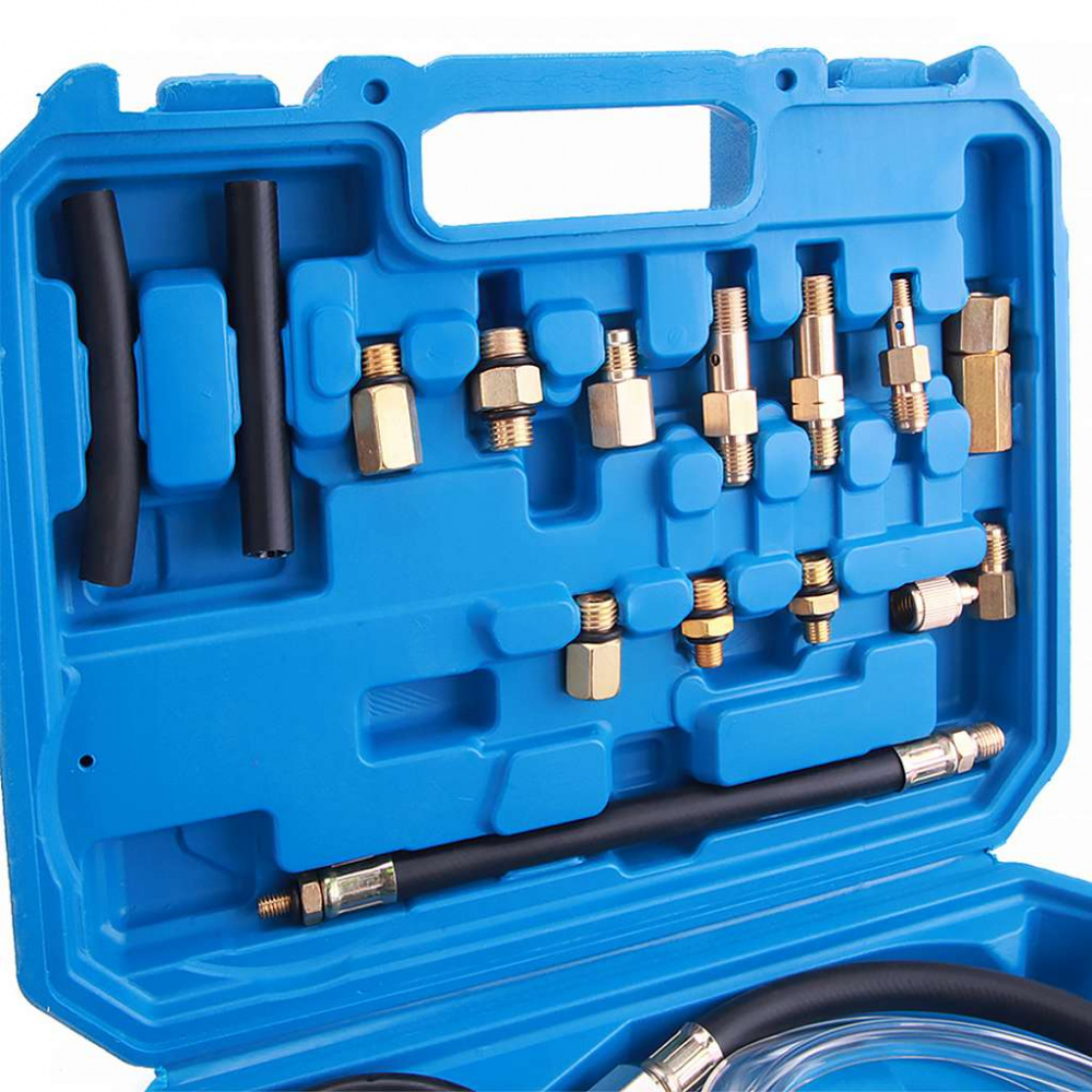 Значительную применяемость прибора обеспечивает комплект соединительных адаптеров, штуцеров шлангов и трубок. Используя входящие в комплект штуцера, трубки, адаптеры можно подключаться в разные части топливной системы автомобиля для определения работоспособности бензонасоса, пропускной способности топливного фильтра, определения давления в топливной рампе и многие другие тесты позволяющие определить состояние топливной системы автомобиля.