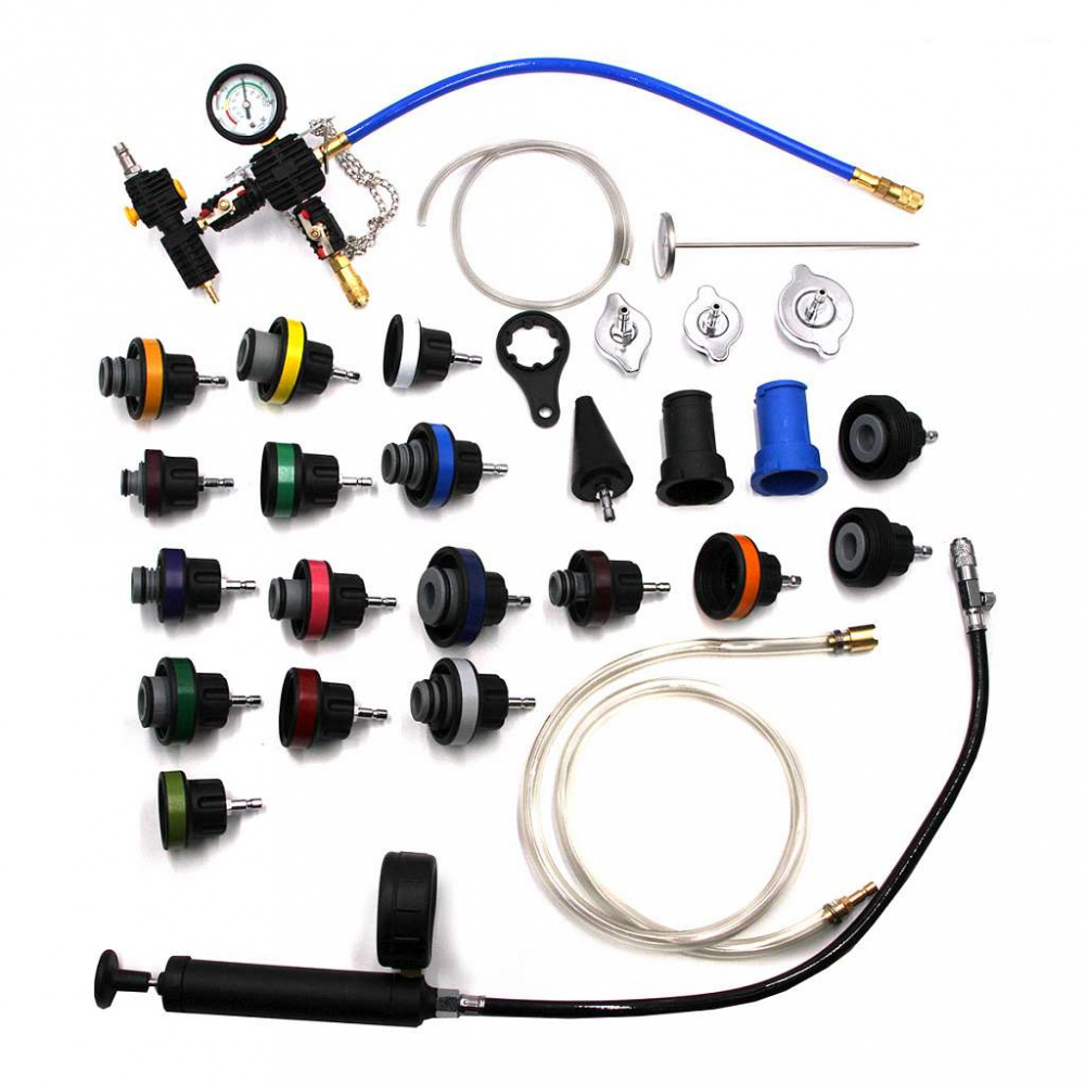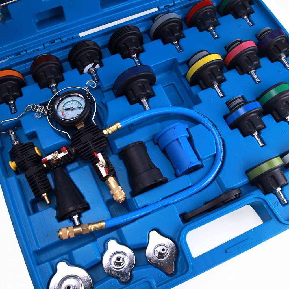 Набор для проверки герметичности системы охлаждения 28 предметов применяется для опрессовки системы охлаждения автомобиля. Набор поможет проверить на герметичность охладительную систему практически любого автомобиля, как нового поколения, так и более ранних годов выпуска.
