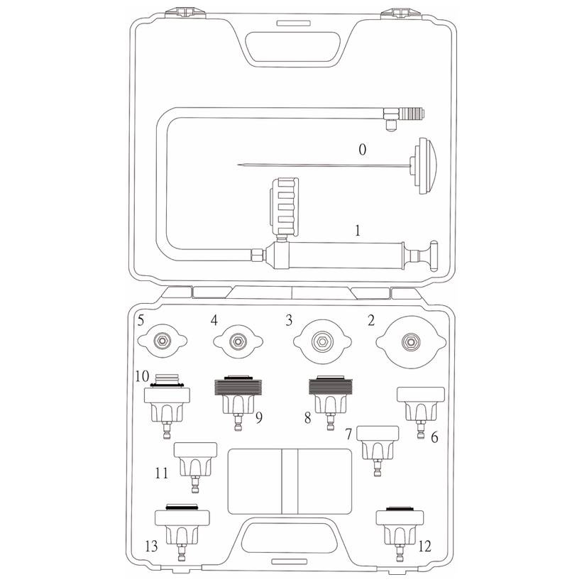 Комплект состоит из термометра, ручного насоса и 12 поверочных крышек:- Поверочная крышка №2. Применение: GM (Cadillac).