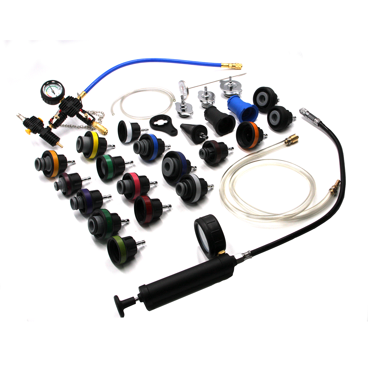 Набор для проверки герметичности системы охлаждения 28 предметов применяется для опрессовки системы охлаждения автомобиля. Набор поможет проверить на герметичность охладительную систему практически любого автомобиля, как нового поколения, так и более ранних годов выпуска.