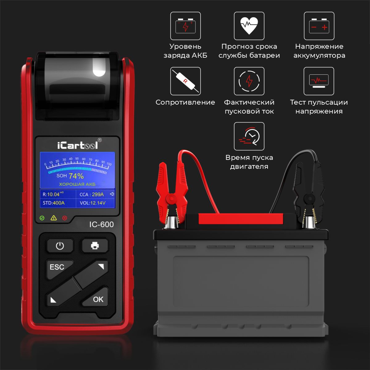 Тестер аккумуляторных батарей iCartool IC-600 предназначен для оценки состояния АКБ и определения основных неисправностей в системе пуска двигателя и зарядки. Тестирует все типы АКБ напряжением 6В, 12В, 24В.