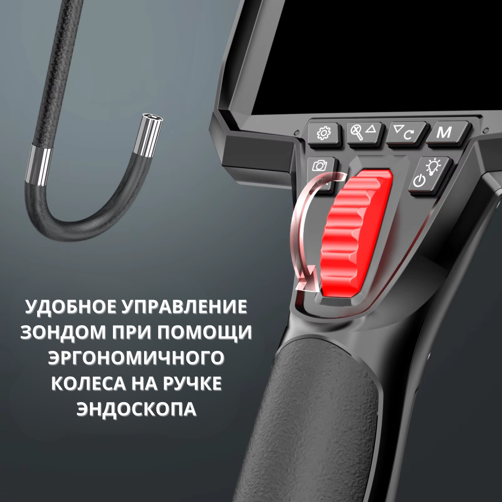 Отличительной особенностью видеоэндоскопа является наличие механизма управления наконечником зонда. Камера вращается на 180 градусов в обе стороны при помощи специального колеса на корпусе прибора. Таким образом можно производить осмотр стенок цилиндра двигателя, повернув камеру на 90°. А при развороте на 180° можно оценить и состояние клапанов, что даёт более объективную картину о состоянии камеры сгорания.