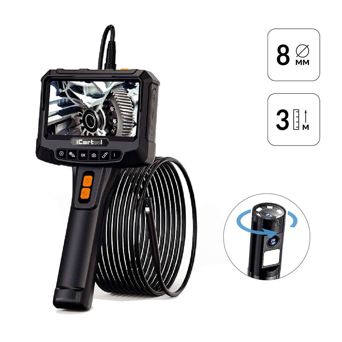 Промышленный видеоэндоскоп iCartool IC-VC700R-3 имеет 2 камеры и экран с разрешением HD, матрицей IPS и диагональю 5”. Главная особенность видеоэндоскопа – возможность управлять положением боковой камеры, вращая её на угол до ±350 градусов для кругового обзора.