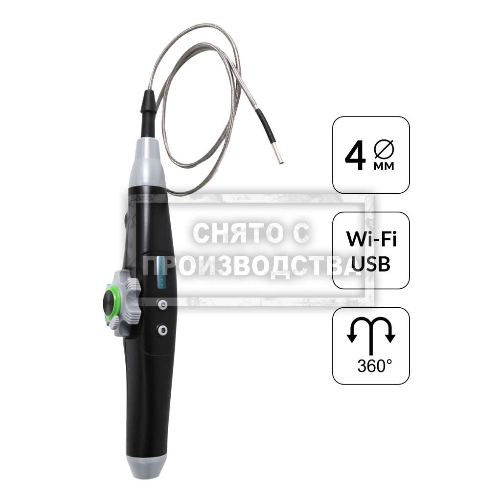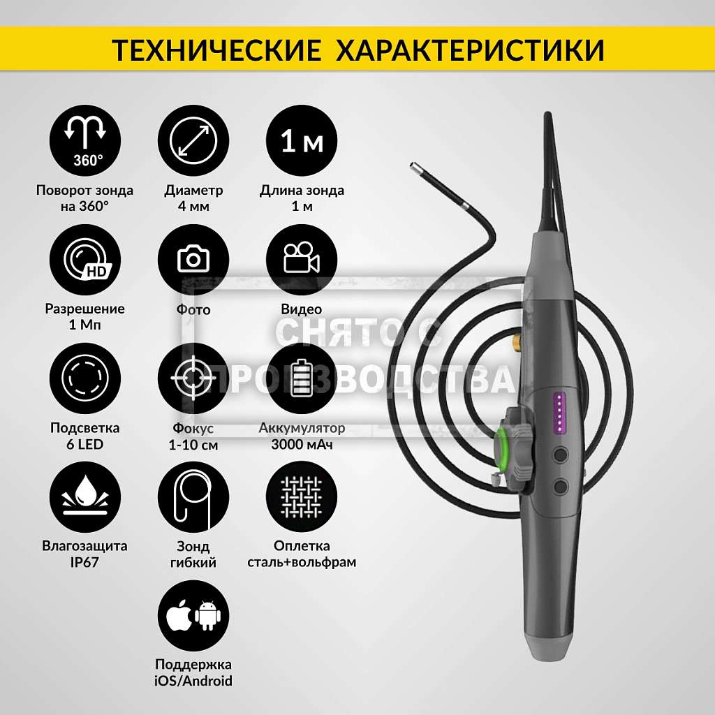 Зонд эндоскопа гибкий, имеет длину 1 метр и диаметр 4 мм. Широкий угол обзора 120° и HD камера с разрешением 1 мегапиксель обеспечивают прекрасный обзор. Для работы в темных местах предусмотрена регулируемая LED подсветка. Корпус эндоскопа легкий, удобно лежит в руке . Встроенная литиевая батарея обеспечивает работу до 6 часов без подзарядки.