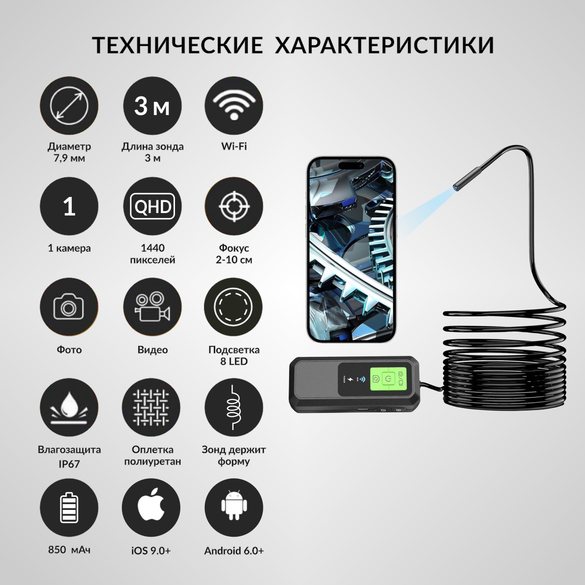 Зонд эндоскопа полужесткий, с эффектом памяти формы имеет длину 3 м и диаметр камеры 7,9 мм. Благодаря регулируемой светодиодной подсветке высокой интенсивности на экране смартфона формируется четкая картинка. Управление съемкой ведется с помощью собственного приложения с расширенным функционалом, основные команды продублированы кнопками на корпусе Wi-Fi-модуля.