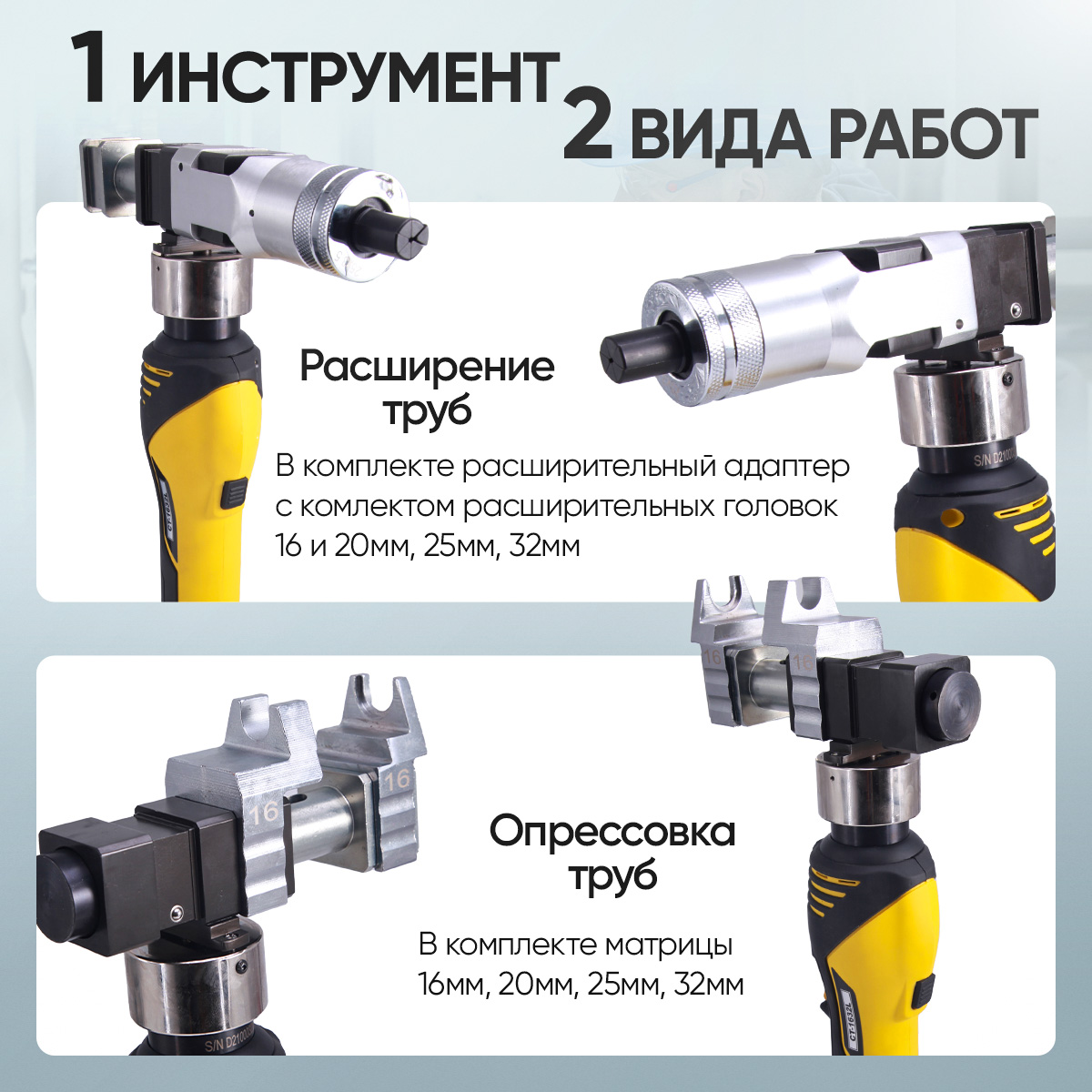 - Головки для опрессовки: 16-20 мм, 25-32 мм