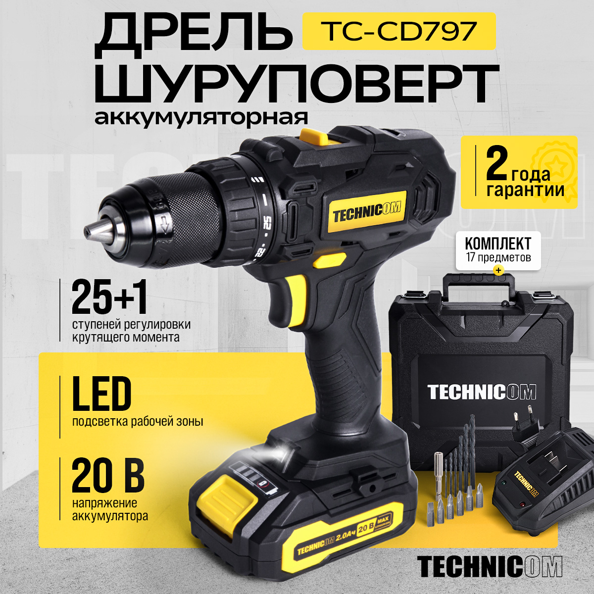 Дрель-шуруповёрт аккумуляторная TECHNICOM TC-CD797 – это аккумуляторная дрель-шуруповёрт, мощная и производительная, обладает, прекрасными характеристиками для использования как в быту, так и в профессиональной деятельности, прекрасно справляется с закручиванием саморезов и сверлением отверстий в бетоне, металле и дереве. В комплекте идёт несколько приятных бонусов, таких как набор бит, набор свёрл, поясное крепление.
