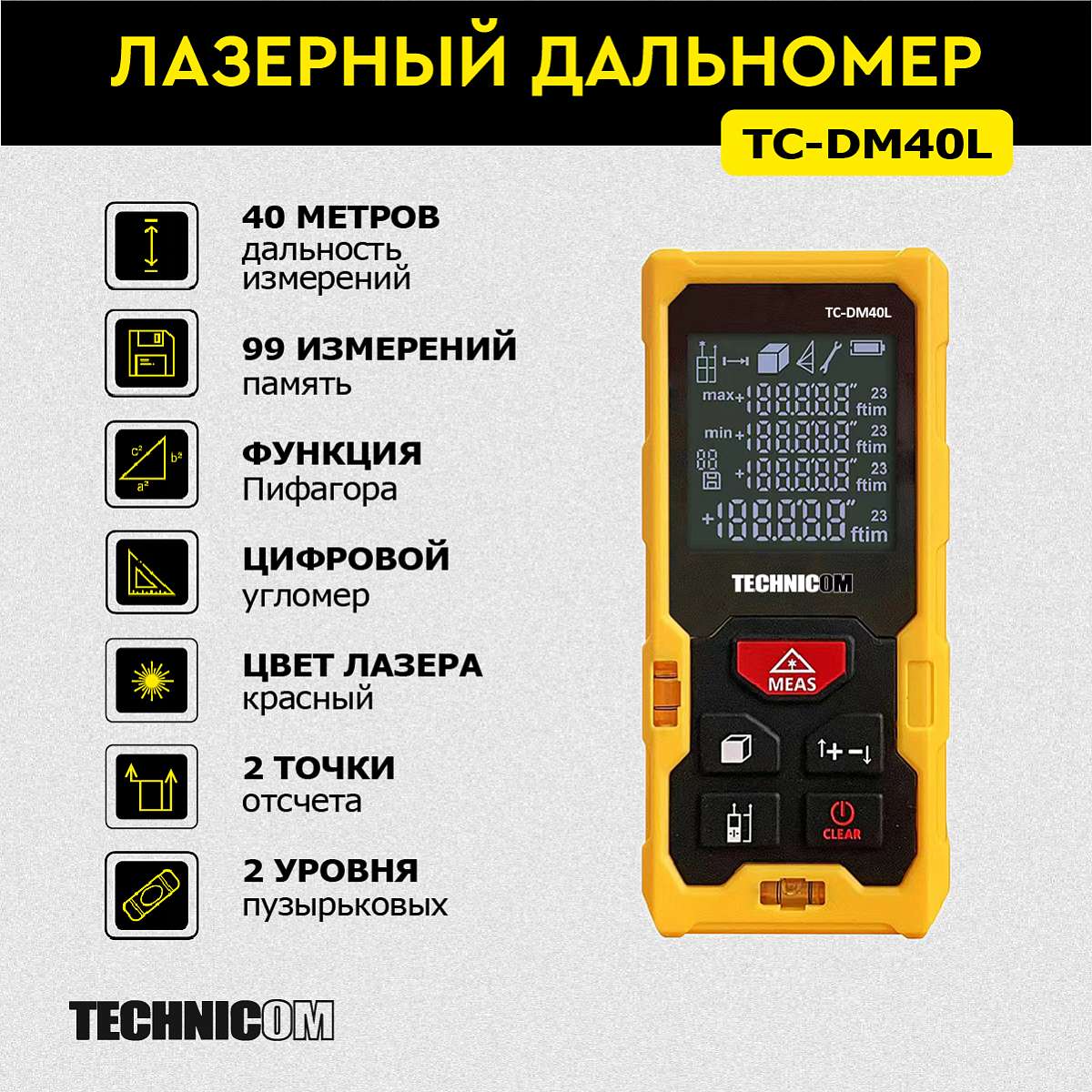 Лазерный дальномер TC-DM40L – небольшой, удобный, точный прибор для проведения измерений на расстоянии 40 метров. Все измерения можно проводить в метрах, футах или дюймах. Отличительными чертами данного дальномера являются: скорость проведения измерений 0,25с, информативный четырехстрочный дисплей, два пузырьковых уровня, отверстие под штатив ¼”, степень влагозащиты IP54. Данный прибор имеет 2 точки отсчёта и функцию измерения углов. C помощью лазерного дальномера TC-DM40L можно выполнять все основные типы измерений: расстояние до объекта, длина, ширина, высота, вычисление площади и объема, специфические измерения, такие как функция Пифагора.