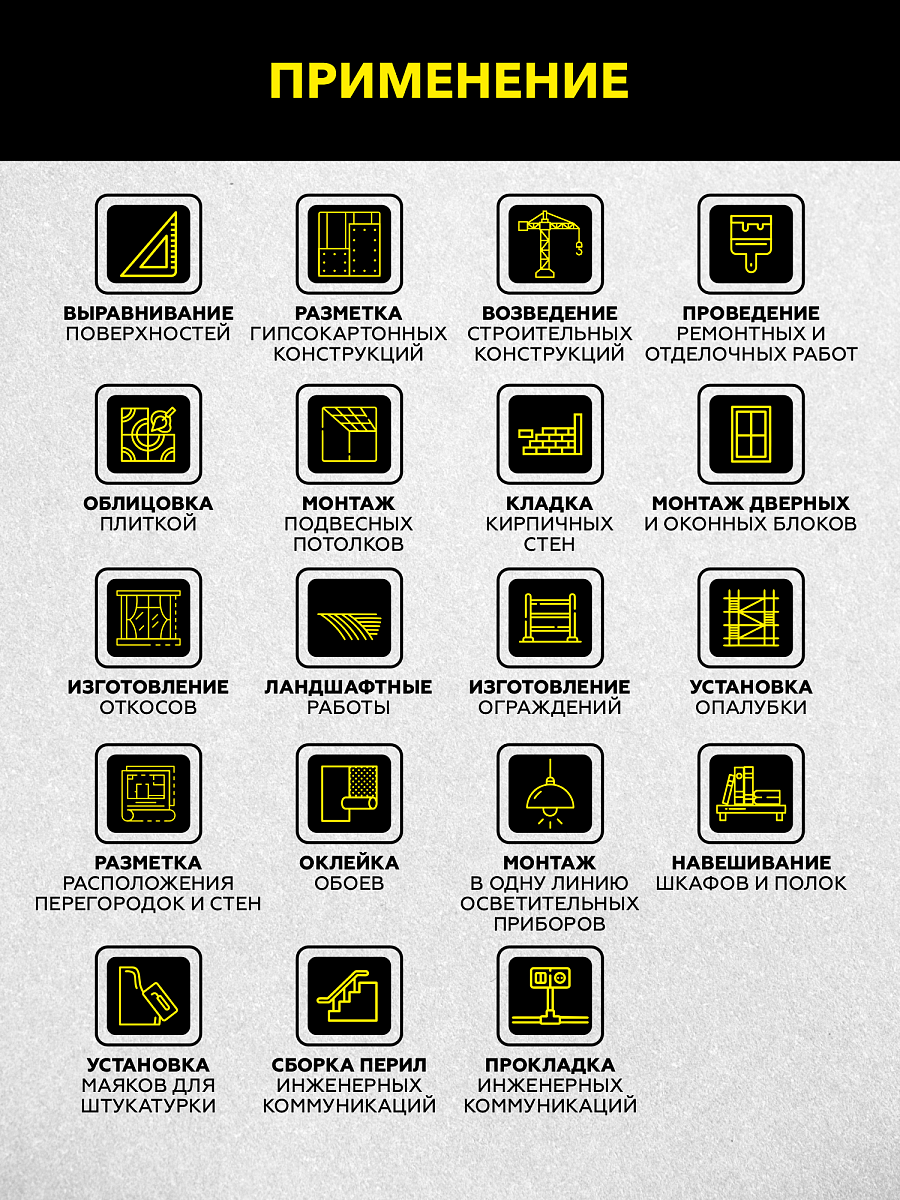 Лазерный уровень TC-LL35G предназначен для построения световых линий на вертикальных или горизонтальных плоскостях помещения. Позволяет ускорить с высокой точностью разметку стен, пола или потолка жилых, или общественных помещений. Данный уровень имеет компактные размеры и небольшой вес. Прост в управлении. При всём при этом обладает повышенной степенью влагозащиты IP54. Для удобной эксплуатации, в функционале лазерного уровня предусмотрены несколько режимов: горизонталь, вертикаль и перекрестье, 3 уровня интенсивности свечения. Будучи высокоточным прибором, лазерный уровень TC-LL35G оснащен функцией автоматического самовыравнивания +/- 4°и обеспечивает точность измерений +/-2,5 мм. Цвет лазерного луча зеленый, а дальность построения составляет 30 метров. Кроме того, для оповещения пользователя предусмотрены световая и звуковая индикация.