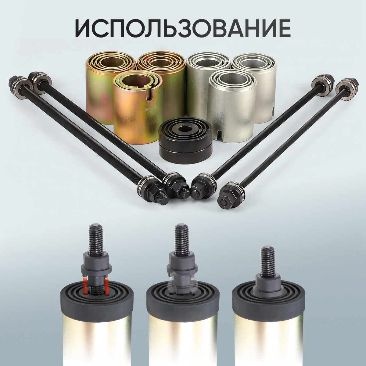 Универсальный набор используется для снятия и установки подшипников, подшипников с резиновой втулкой, сайлентблоков, втулок. Подходит для большинства автомобилей.