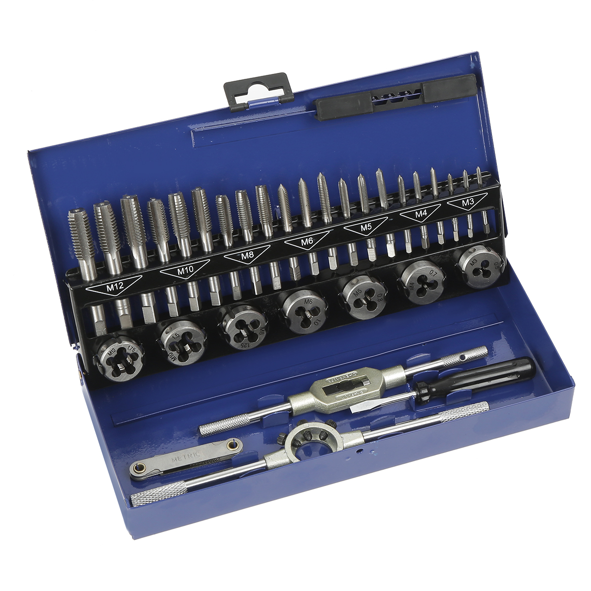 Набор резьбонарезного инструмента метрической резьбы М3-М12 для нарезания внутренних и наружных резьб. Инструмент изготовлен из инструментальной легированной стали 9ХС. Набор позволяет работать с цветными металлами, сталью и другими материалами. Набор представлен в металлическом кейсе для удобства транспортировки и хранения. В наборе 32 предмета.
