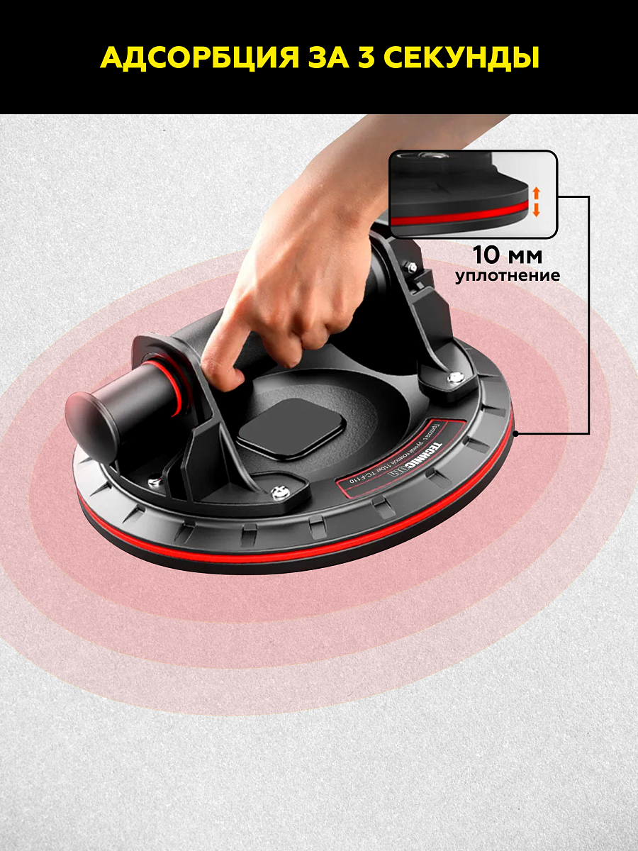 Присоска с ручной помпой 110кг TC-F110 подходит для переноски и укладки любых материалов с плоской и не шероховатой поверхностью. Данная присоска имеет чашу диаметром 200 мм и достаточно толстый герметизирующий слой 10 мм. Очень быстрое и надежное сцепление с поверхностью выполняется в считанные секунды посредством помпы расположенной в ручке вакуумной присоски. Для быстрой разгерметизации применяется кнопка сброса вакуума, также расположенная в ручке присоски. Максимальная нагрузка (вертикальная) 75 кг. Максимальная нагрузка (горизонтальная) 110 кг.