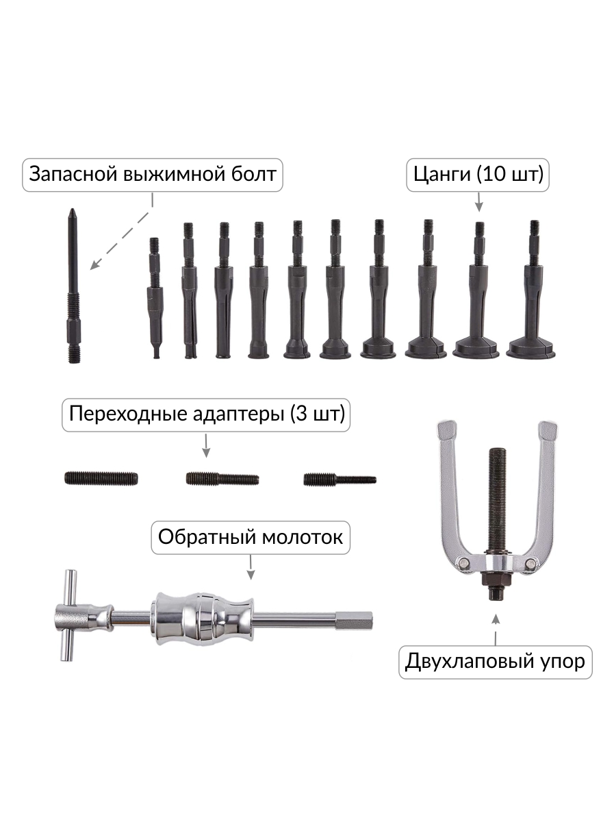 Набор комплектуется инерционной частью в виде обратного молотка и опорой для извлечения подшипников с помощью ходового винта.