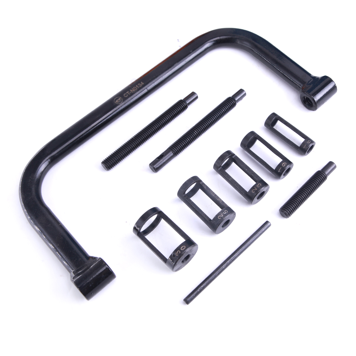Универсальный рассухариватель клапанов с 5-ю сменными насадками предназначен для демонтажа и установки клапанов на двигателях со снятой головкой блока. Имея такой набор в своем инструментарии, вам не придется задумываться о том, что инструмент может не подойти по размерам к поступившему в ремонт двигателю. Инструмент универсален, так как в комплекте несколько сменных адаптеров под разные размеры клапанов.