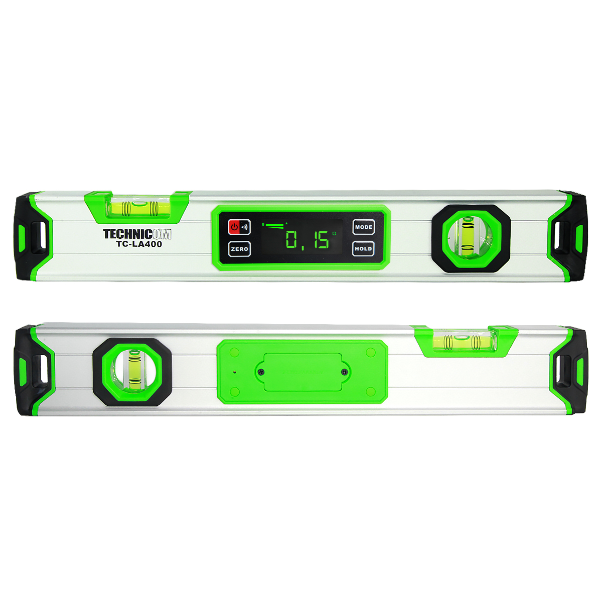 TC-LA400 – цифровой уровень-угломер, который является универсальным инструментом для измерения углов при выполнении различного рода работ связанных со строительством. Сделанный из массивного алюминиевого профиля одновременно обладает лёгкостью и достаточной прочностью. Все измеряемые значения выводятся на удобный и сверх яркий LED дисплей. Данный прибор обладает высокой точностью измерений: 0.2°. В корпус уровня-угломера встроены ставшие уже классическими пузырьковые уровни для контроля изначального положения. В основание корпуса угломера встроены 6 мощных магнитов, обеспечивающих надежное крепление к стальной поверхности. С обоих торцов располагаются вставки подвесы, выполненные из термопластичной резины, для лучшей защиты прибора от случайного падения.