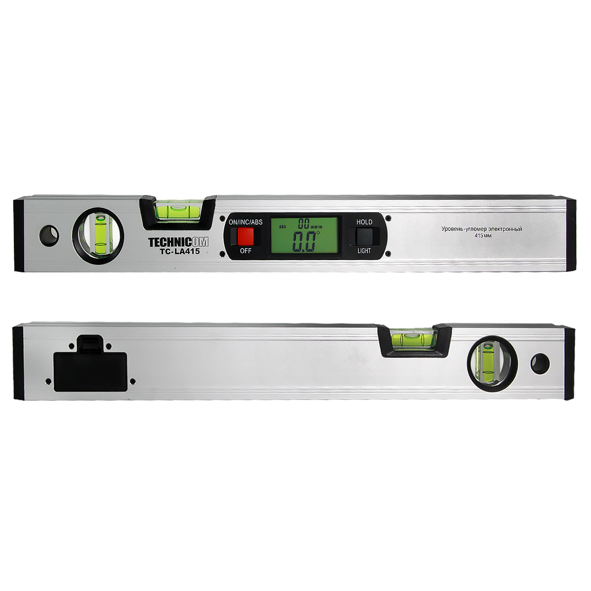TC-LA415 – Электронный уровень-угломер, используется в строительно-монтажных работах для точного измерения и контрольной проверки уровня наклона плоскостей по вертикали и горизонтали при монтаже различных строительных материалов или сборке конструкций. Корпус угломера выполнен из анодированного алюминия, что обеспечивает легкость и прочность конструкции. В качестве источников питания используются 2 батарейки LR03 (AAA), продолжительность работы которых составляет более 100 часов. Данный прибор имеет широкий диапазон измерений от 0 до 360° и высокую точность измерений 0.2°. Для проведения изначальных измерений угломер оснащен двумя пузырьковыми уровнями. Модель TC-LA415 проста в применении и не требует особых навыков, может применяться как в быту, так и на производстве.