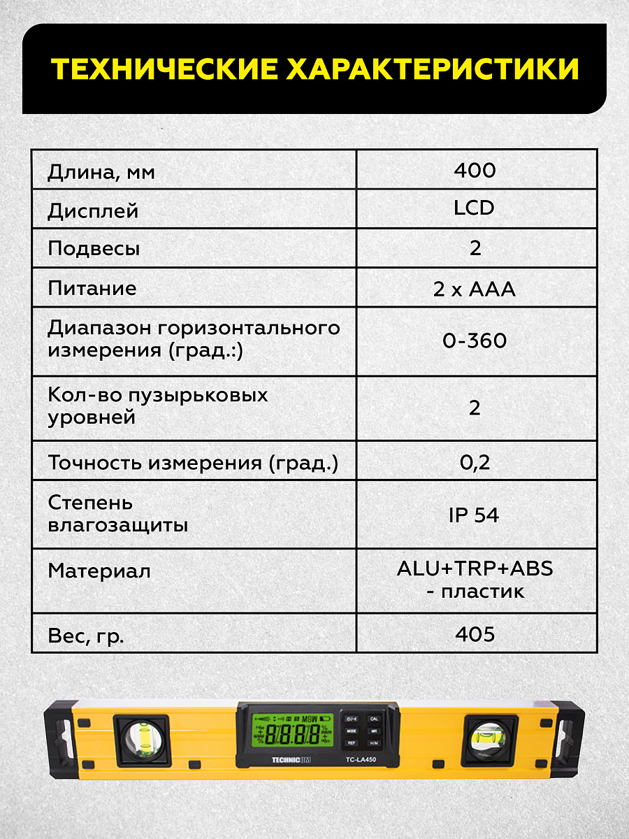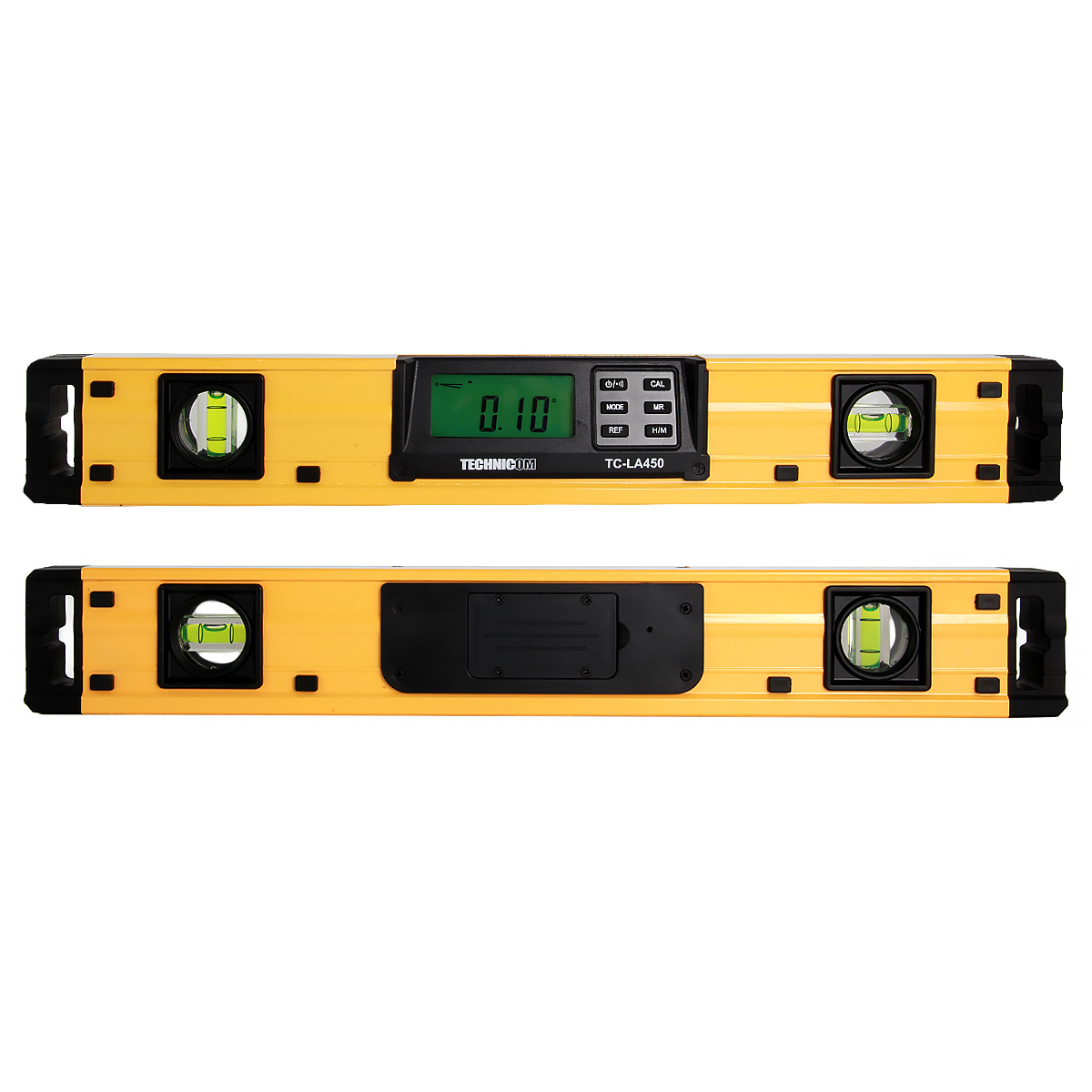 TC-LA450 – это высокоточный уровень-угломер, предназначенный для выполнения измерений при проведении строительно-монтажных работ. Прибор оснащен информативным ЖК дисплеем с подсветкой, что позволяет пользоваться им в условиях недостаточного освещения. Корпус угломера выполнен из анодированного алюминия, что обеспечивает достаточную прочность конструкции. Диапазон измерений составляет 0-360°, а точность измерений 0.2°. Длина прибора составляет 450 мм, что позволяет его использовать не только в бытовом плане, но и в профессиональном. В основании конструкции угломера встроены магниты, обеспечивающие надежное крепление к металлическим поверхностям. Если Вы ищете точный, лёгкий, прочный, с необходимым набором функций для проведения быстрых измерений угломер, то модель TC-LA450 именно то, что нужно!