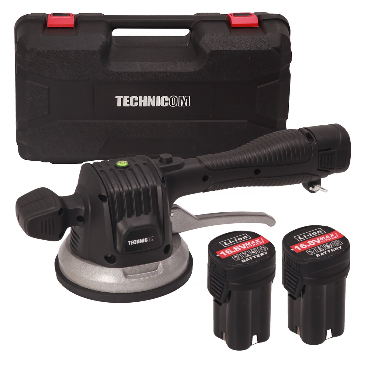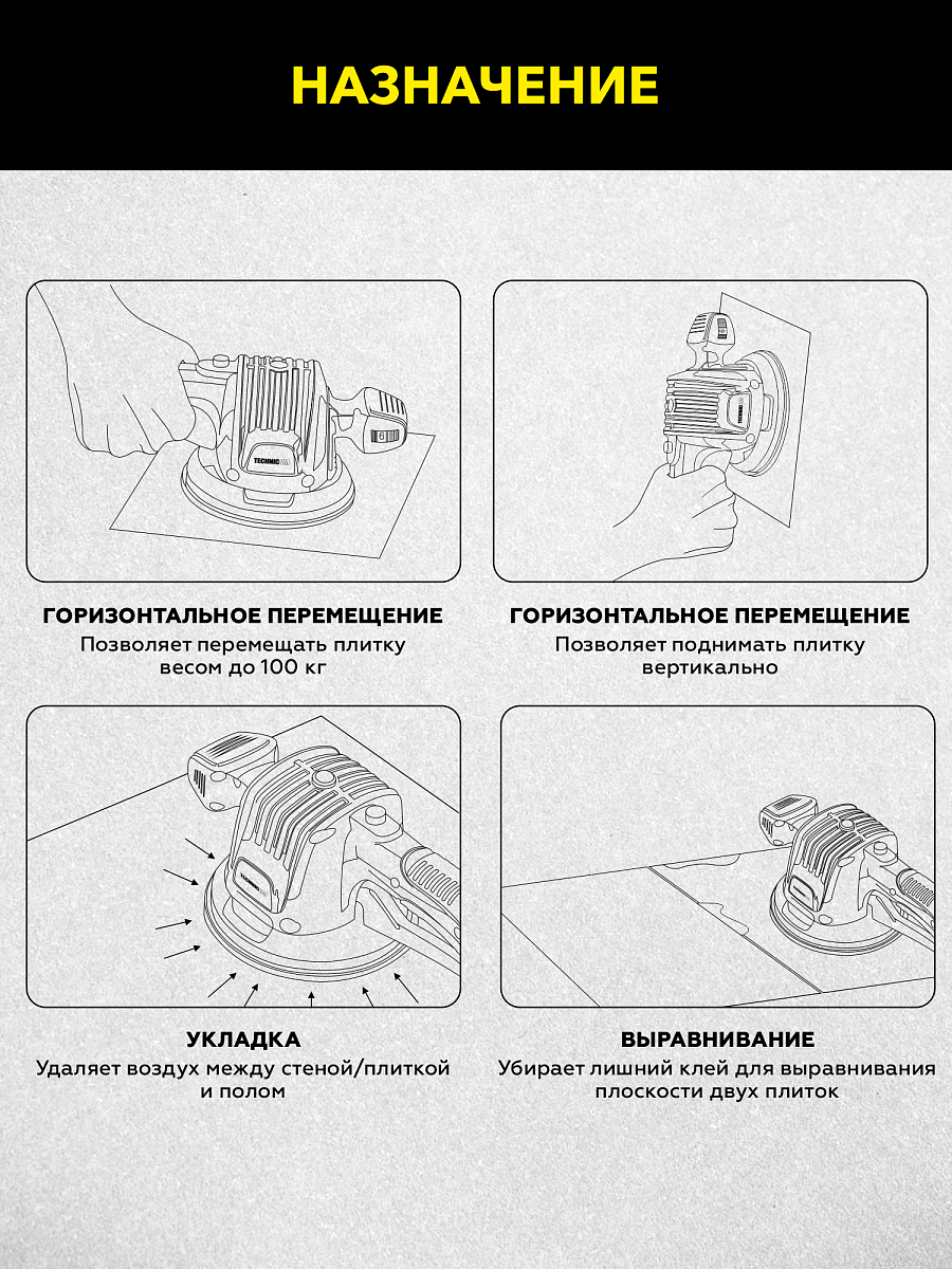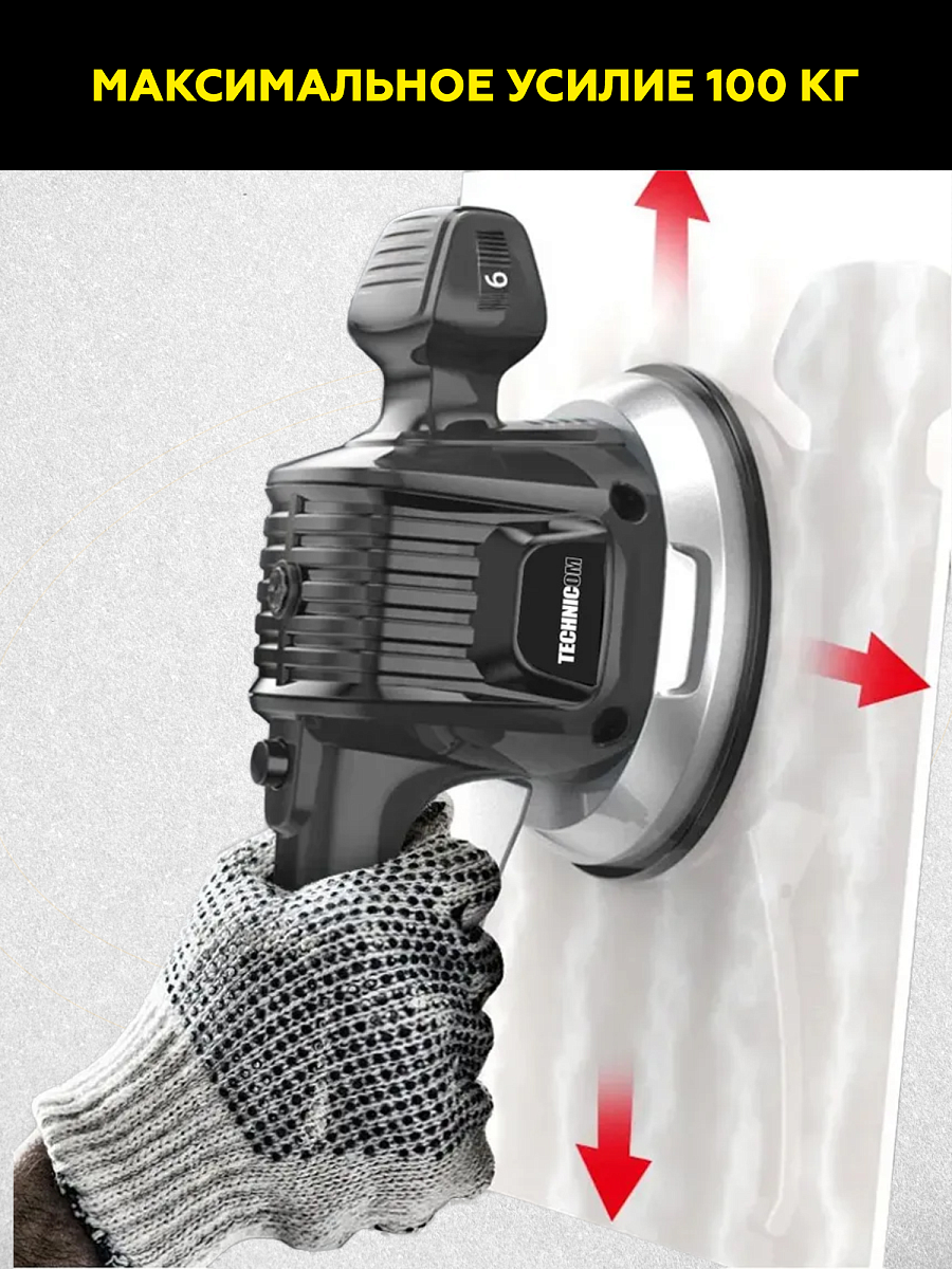 Виброприсоска для укладки плитки TECHNICOM аккумуляторная TC-P0116 - профессиональный многофункциональный инструмент. Прибор имеет функции выравнивания с вибрацией и переноски плоскоповерхностных материалов. Инструмент разработан для переноса, подъема, выравнивания при укладке напольной и настенной плитки больших размеров и веса, керамогранита, гранитных и мраморных плит. Не оставляет пятен на после укладки или переноса.