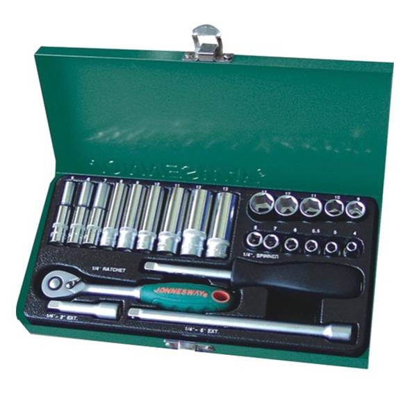 Набор торцевых головок 1/4"DR 4-13 мм, 25 предметов Jonnesway S04H2125S используется в автогаражных мастерских, большой выбор головок - для универсальности использования. Кейс позволяет удобно транспортировать и хранить инструменты.