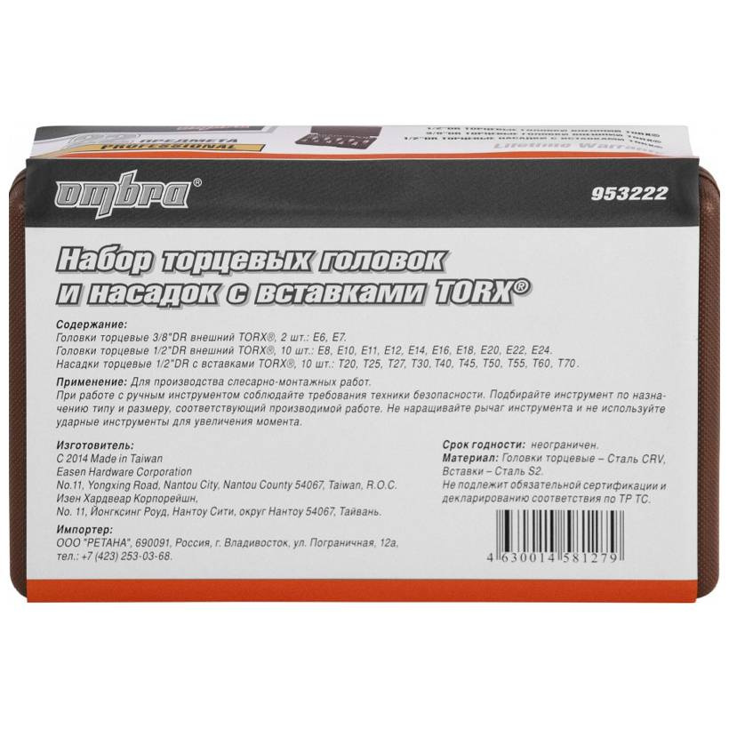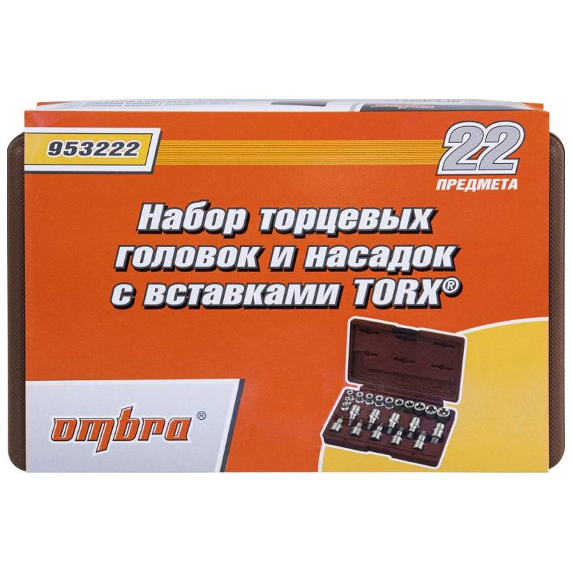 Набор OMBRA 953222 состоит из торцевых головок 3/8 и 1/2 дюйма и торцевых насадок 1/2 дюйма с вставками-битами TORX. 22 предмета в пластиковом кейсе.