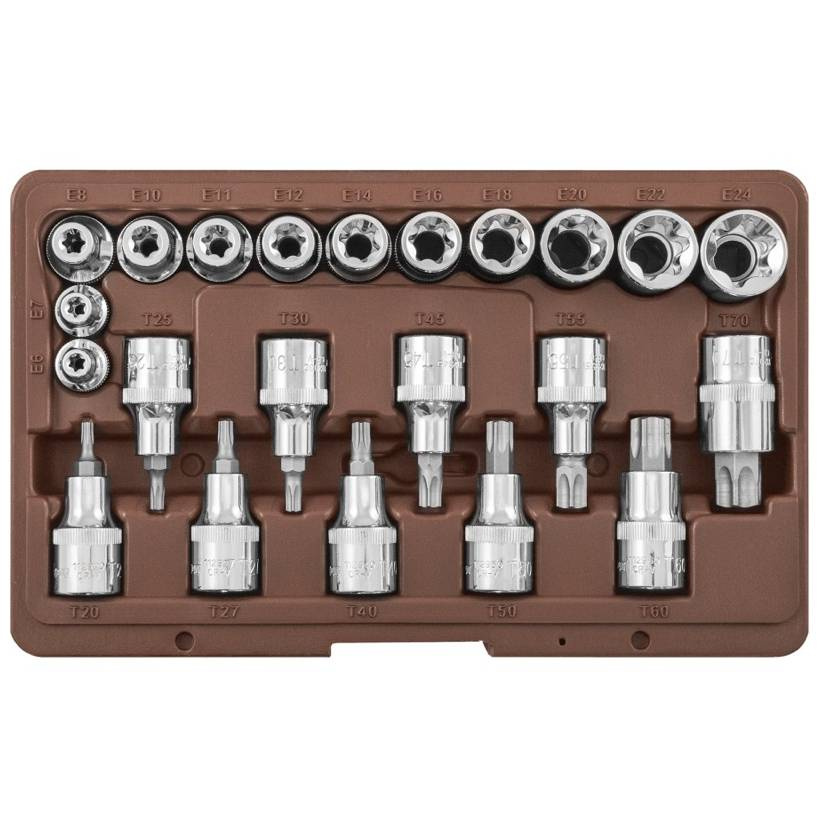 Набор OMBRA 953222 состоит из торцевых головок 3/8" и 1/2" и торцевых насадок 1/2" с вставками-битами TORX. Используется совместно с гайковертом или ручным инструментом. 22 предмета расположены в компактном пластиковом кейсе.