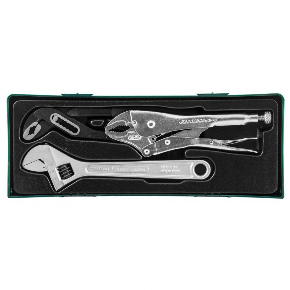 Набор инструментов в ложементе JONNESWAY (артикул P2803SP) используется при ремонтных работах на автотранспорте. Состоит изразводного ключа 250 мм, ручных тисков 250 мм и переставных клещей 250 мм.