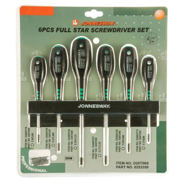 Набор отверток Jonnesway TORX T10-T30 предназначен для использования в гаражах или автомастерских. Стойка для хранения отверток имеет отверстия для возможного крепления набора на стену. Прорезиненные рукоятки обеспечивают надежный хват и предотвращают скольжение рук.