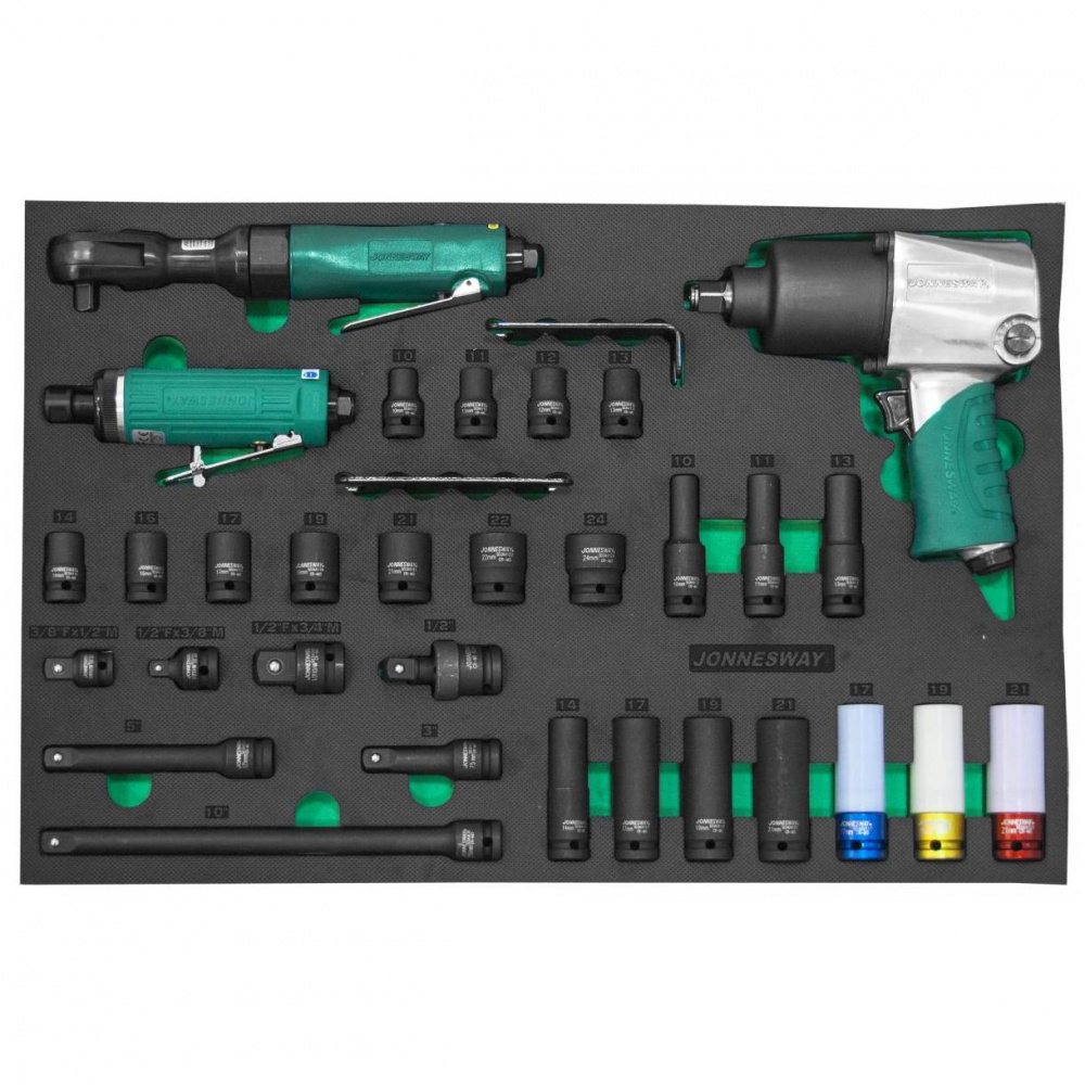 Набор инструментов в ложементе JONNESWAY (артикул JA-C231SV) - 31 предмета для выполнения различных работ с использованием пневмоинструмента. Комплектуется гайковертом, рукояткой трещоточной, бормашинкой и комплектом головок торцевых ударных с удлинителями и переходниками.