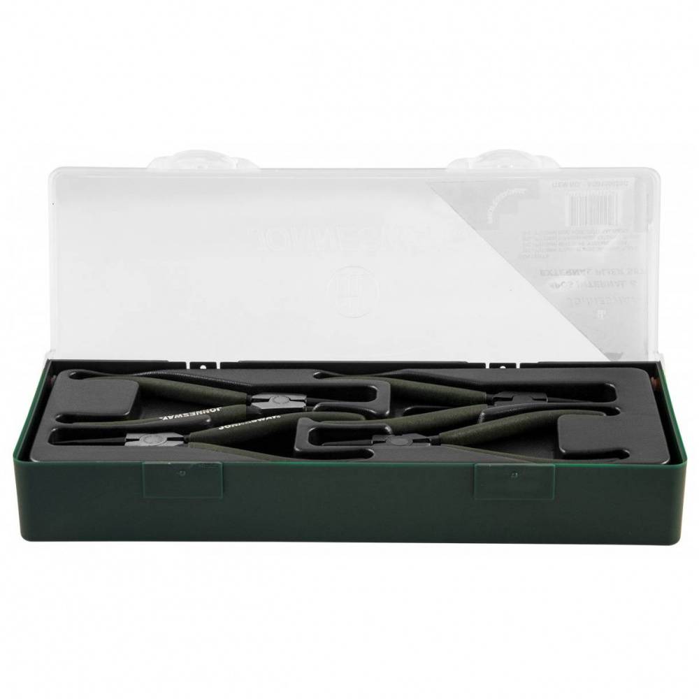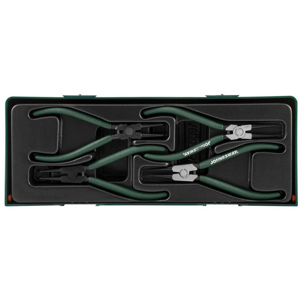 Набор инструментов в ложементе JONNESWAY (артикул AG010002SC) состоит из четырёх щипцов, предназначенных для монтажа и демонтажа внутренних и внешних стопорных колец.