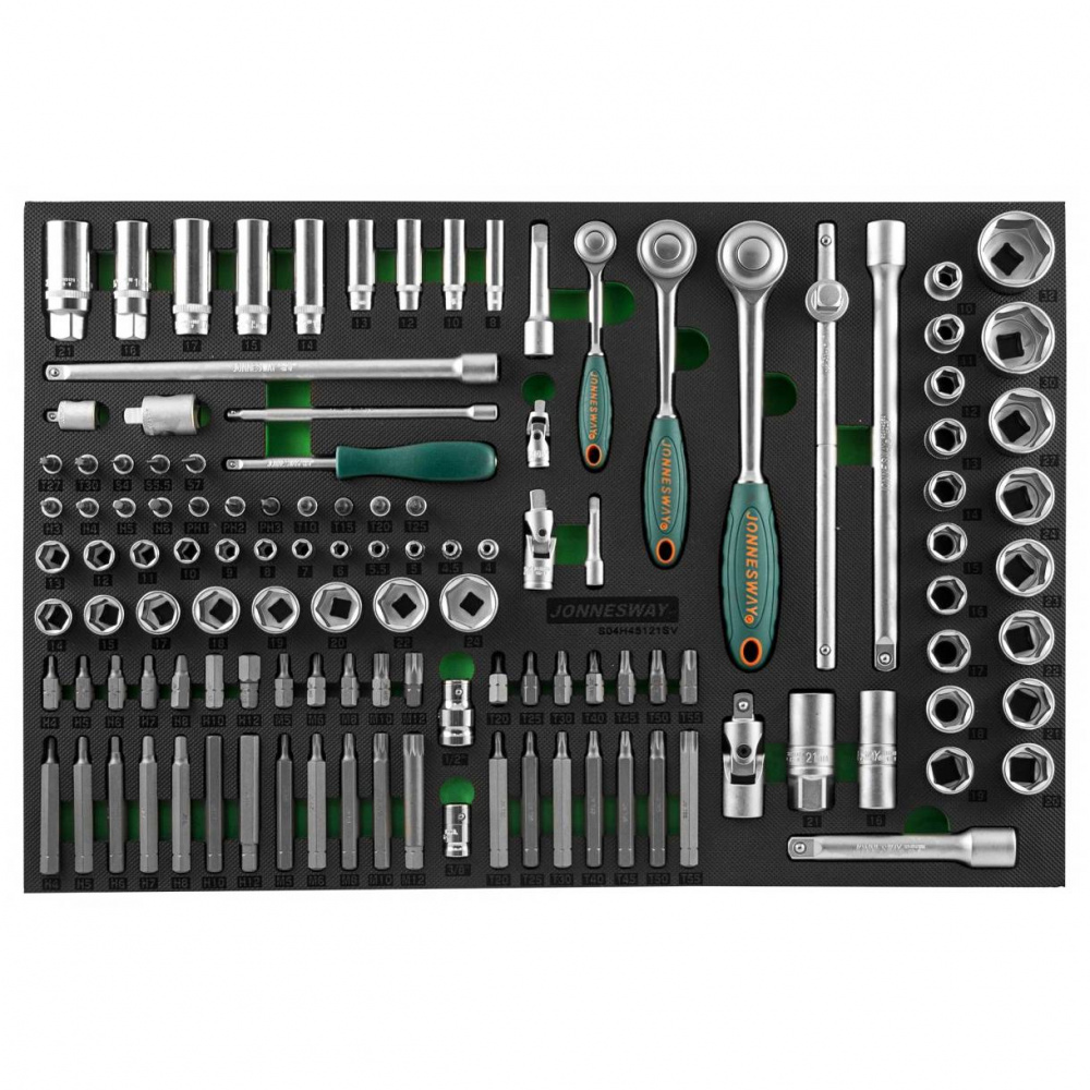 Набор JONNESWAY S04H45121SV содержит в составе торцевые головки с приводами, вставки-биты и прочий вспомогательный инструмент. Инструмент расположен в ложементе 560х400 мм.
