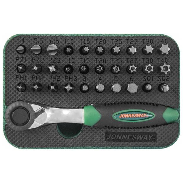 Набор вставок-бит Jonnesway с трещоточной рукояткой мини 1/4"DR, 60 зубцов, 32 предмета